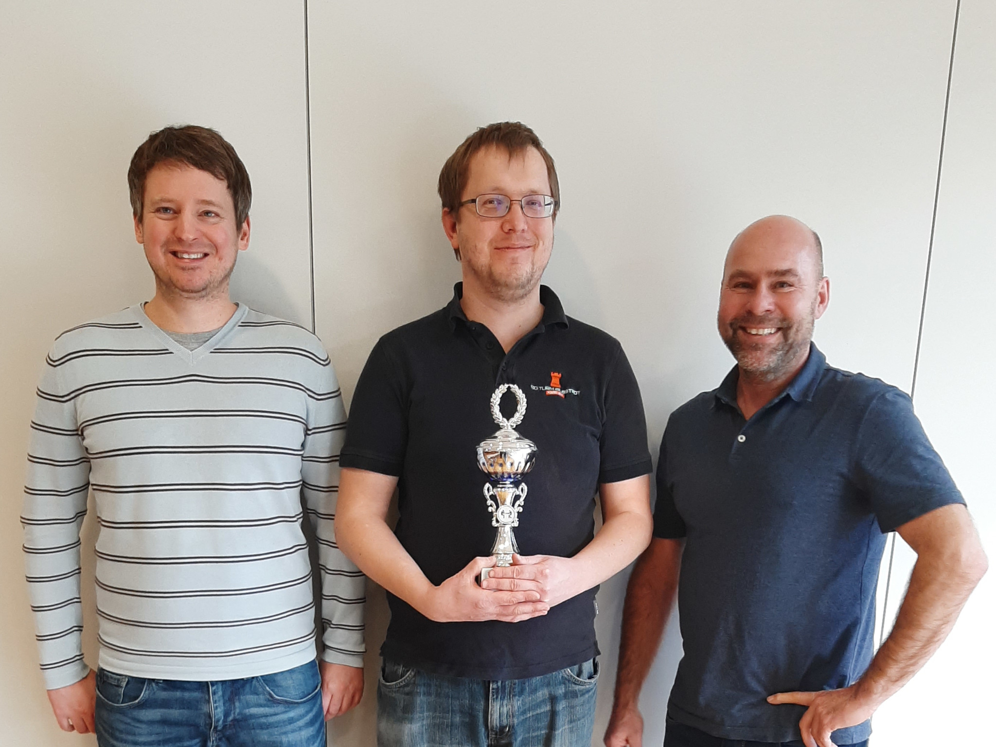 Aufhalten ließ man sich davon natürlich nicht. Es wurden 9 Runden im Modus "Jeder gegen Jeden" mit einer Bedenkzeit von 20 Minuten pro Spieler und Partie gespielt. Dabei zeichnete sich bald ein Kopf-an-Kopf-Rennen zwischen dem Vorsitzenden Axel Birkholz und Spielleiter Christof Beuter ab, die beide nur jeweils ein Unentschieden abgeben mussten, alle anderen Partien jedoch gewannen. Der direkte Vergleich zwischen den beiden endete ebenfalls unentschieden und so musste aufgrund Punktgleichheit über die Feinwertung entschieden werden.